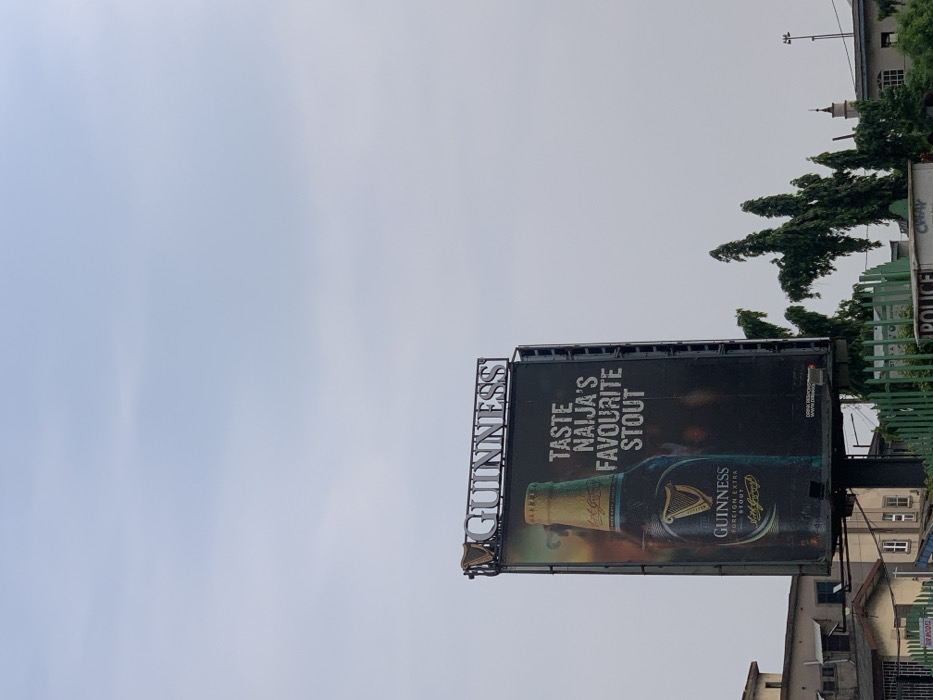 The scene depicts a street view in Alagbede, Nigeria, under an overcast sky. A large, prominent billboard stands centrally, advertising "GUINNESS" with its logo at the top. The advertisement features a bottle of "GUINNESS FOREIGN EXTRA STOUT" and the text "TASTE NAIJA'S FAVOURITE STOUT". The billboard is mounted on a dark, vertical support structure. In the foreground, a green metal fence runs horizontally across the lower portion of the image. Behind this fence, a white sign bears the word "POLICE" in black capital letters, with partially visible text "OWAY" next to it. To the left of the billboard, several multi-story buildings with light-colored facades and dark roofs are visible, suggesting residential or commercial structures. Some external pipes or structures are present on these buildings. To the right of the billboard, a cluster of tall, slender trees with dense green foliage rises. Beyond the trees, a light-colored building with a distinctive domed or pointed architectural feature, resembling a minaret, is discernible against the skyline. A tall, thin pole or mast extends upwards in the far right background. No specific individuals or active interactions are visible.
