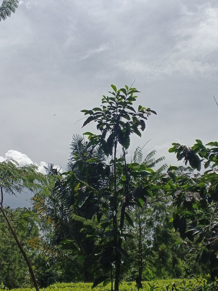 A cloudy sky looms over lush green vegetation. A tall, slender tree with broad leaves reaches towards the sky, dominating the frame. Surrounding it, various other trees and shrubs create a dense forest-like environment. Light and shadows interplay across the leaves, enhancing the depth and texture of the foliage. The lower portion of the image hints at a field or ground cover, completing the natural scene.