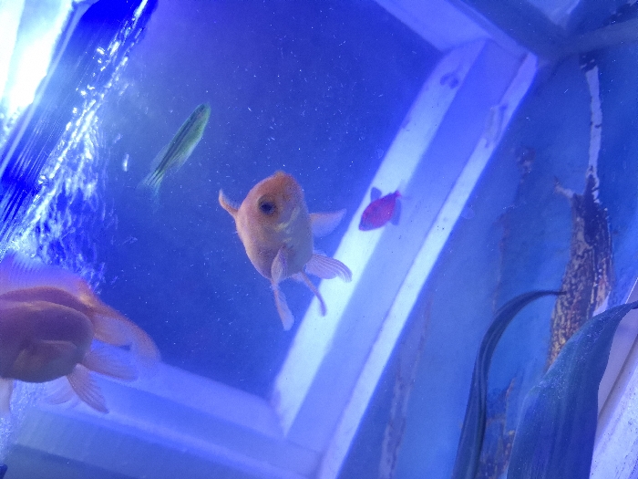 The image displays an underwater perspective within an illuminated aquarium or fish tank, characterized by a predominant blue light. Several fish are visible: A large, light-orange fish, consistent with a goldfish, is partially cropped in the upper left, oriented towards the water surface. Centrally, a smaller, light-orange goldfish-type fish with prominent eyes and fins swims horizontally. Above and to the right of this fish, a slender, greenish-grey fish with horizontal stripes moves through the water. In the mid-right section, a small, vibrant red fish is present. The lower portion of the tank contains dark green aquatic plant leaves on the left and a dark, textured piece of wood or decor on the substrate. White structural elements, resembling tank bracing or internal framing, are observable through the water. The water exhibits minor suspended particulate matter. The exact location within Fergana City, Uzbekistan, is not discernible from the visual information presented in the image.