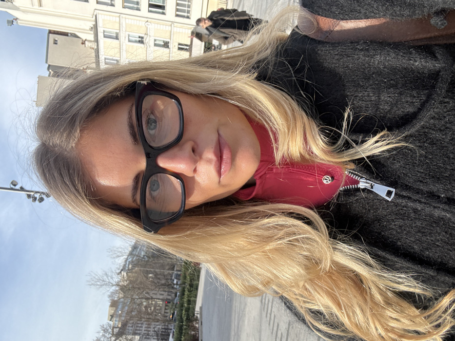 An adult female is depicted in a close-up, self-portrait-style photograph taken outdoors in Neuilly-sur-Seine, France. She has long, wavy blonde hair, fair skin, and blue eyes, partially obscured by thick-framed black eyeglasses. She wears a bright pink quarter-zip top with a visible Lululemon logo on the left collar area, layered under a textured black zippered coat featuring a prominent silver zipper pull. A brown strap, consistent with a shoulder bag, is visible over her right shoulder. Her expression is neutral, and she looks directly into the camera. The background reveals an urban environment under a clear, sunny sky. To the left, a wide, open paved plaza or square is visible, flanked by bare deciduous trees and multi-story buildings in the distance. A tall, modern street light pole with multiple fixtures extends upward on the far left. To the right, multi-story, light-colored European-style buildings with traditional windows are present. A male individual wearing a dark coat walks in the background on the right side of the frame. The scene is illuminated by direct sunlight, creating distinct shadows.
