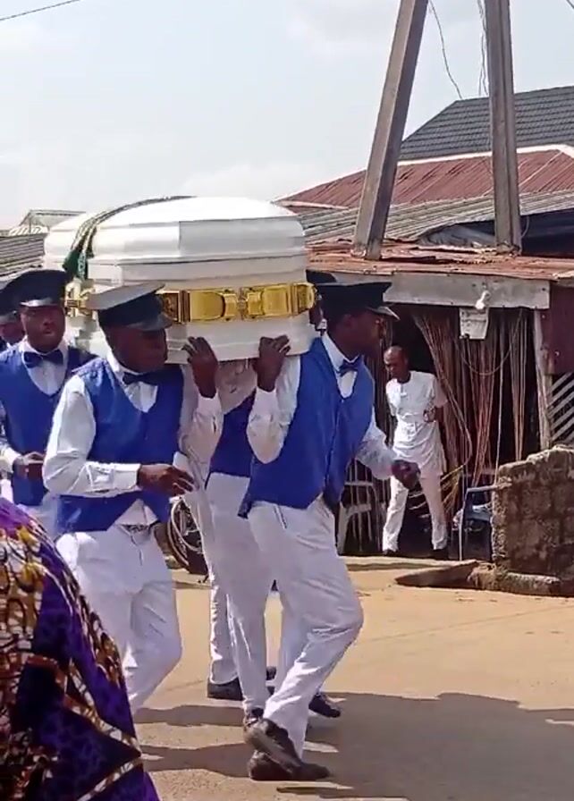 A group of men in matching outfits (white pants, white shirts, blue vests, black hats, and black bow ties) are carrying a white casket with gold handles down a street. A drone is flying overhead near power lines. There are people standing on the side of the road, and some motorcycles are parked nearby. There are buildings on either side of the street. The sky is partly cloudy. A brass band plays music.
