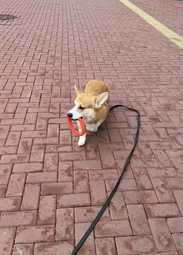 Corgi dog carrying a red ring toy on a paved path. The dog is on a leash. The path is made of reddish-brown bricks. The dog walks toward the camera and then turns and walks away. There is a metal fence and building to the right. In the distance is a river or lake.