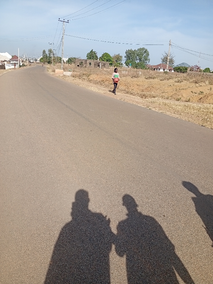 An outdoor scene in Kwang, Nigeria, depicts a paved road curving gently to the left under a clear, bright sky. In the mid-ground, a person, appearing to be a young female, walks along a dry, unpaved shoulder parallel to the road, moving away from the viewer. She wears a light-colored long-sleeved top with green markings and dark shorts, carrying a red bucket in her left hand and a lighter-colored bucket in her right hand. To the right of the road, the terrain is characterized by dry, light brown soil and sparse, dry vegetation, with several mounds of disturbed earth. Further back, skeletal remains of unfinished or damaged concrete structures are visible, alongside scattered trees and distant residential buildings with various roof types. Utility poles with overhead power lines run along the left side of the road and across the upper portion of the frame. In the foreground, on the paved road, three distinct, elongated shadows of individuals are cast by the sun, indicating the presence of multiple people, including the photographer, standing behind the camera's perspective. The shadows are dark and extend towards the middle ground, with one shadow appearing to hold a device, possibly a camera or phone.