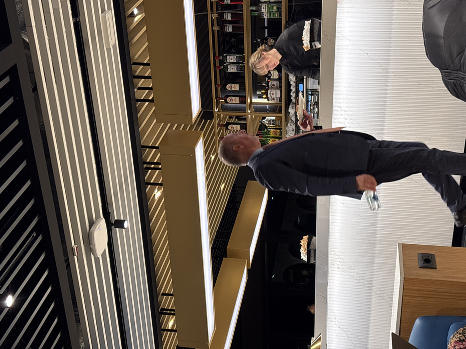 This image depicts an interior scene of a modern bar or lounge, most likely situated within Leonardo da Vinci International Airport (FCO) in Fiumicino, Italy. A middle-aged man, with fair skin and light brown receding hair, is captured mid-stride, walking from left to right in the foreground. He is dressed in a dark blue suit, a light blue collared shirt, and an orange tie. His left hand holds a small white plate containing an unidentified snack, while his right hand grasps a clear glass bottle. He is looking towards the right side of the frame, past the bar. Behind a contemporary white bar counter, which features a vertically ribbed texture on its front and a light-colored, subtly marbled countertop, stands a young woman. She has fair skin and light blonde hair pulled back, and is wearing a black uniform, indicative of a bartender or server role. Behind her, shelves are visible, meticulously stocked with various liquor bottles, including brands like Campari, Martini, and different whiskies, alongside coffee cups and machinery. The ceiling above the bar area displays a distinctive design of alternating black and light-colored horizontal slats. From this ceiling, several recessed spotlights and two prominent, rectangular gold-colored light fixtures are suspended, providing illumination. A white wireless access point or similar device is also mounted on the ceiling structure. In the lower-left quadrant of the image, a wooden side table with a visible electrical outlet and a portion of a blue upholstered chair are present. The overall environment appears clean, well-lit, and modern.