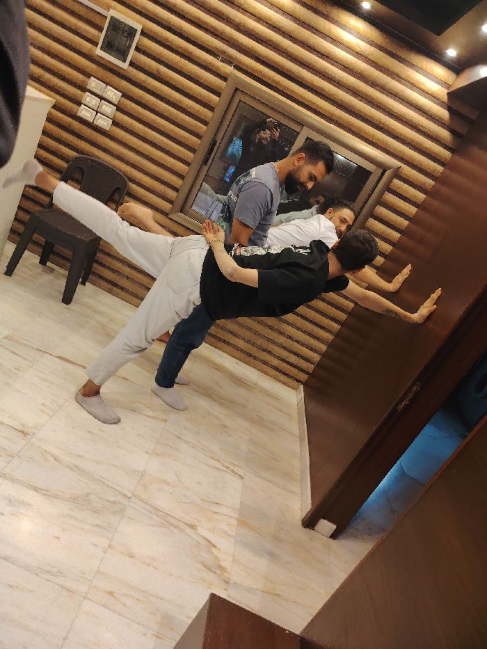 In an indoor setting within Barza Municipality, Syria, three adult males are engaged in a physical activity. The foreground subject, wearing a black t-shirt and light-colored pants with light grey slipper-socks, is bent forward at the waist, with both hands pressed against a dark brown vertical wall or door frame. His right leg is extended backward and upward, bare-footed, while his left foot in a slipper-sock remains on the light-colored marble-patterned floor. A light-colored bracelet is on his left wrist. Immediately behind him, a second male, wearing a white t-shirt, faces forward, appearing to spot or assist the foreground subject. A third male with a beard, dressed in a grey t-shirt, stands behind the second, also observing or assisting. The room features light-colored, veined marble tiles on the floor. The background wall is covered with horizontal light brown wooden slats, incorporating a rectangular window that reflects the individuals and a darker section of the room. Above the window, a small framed object and a bank of six light switches are mounted on the slatted wall. The ceiling is dark, with recessed spotlights. To the far right, a partially open dark brown door reveals a dimly lit space with a blue hue. A dark brown plastic chair is visible on the left side of the frame.