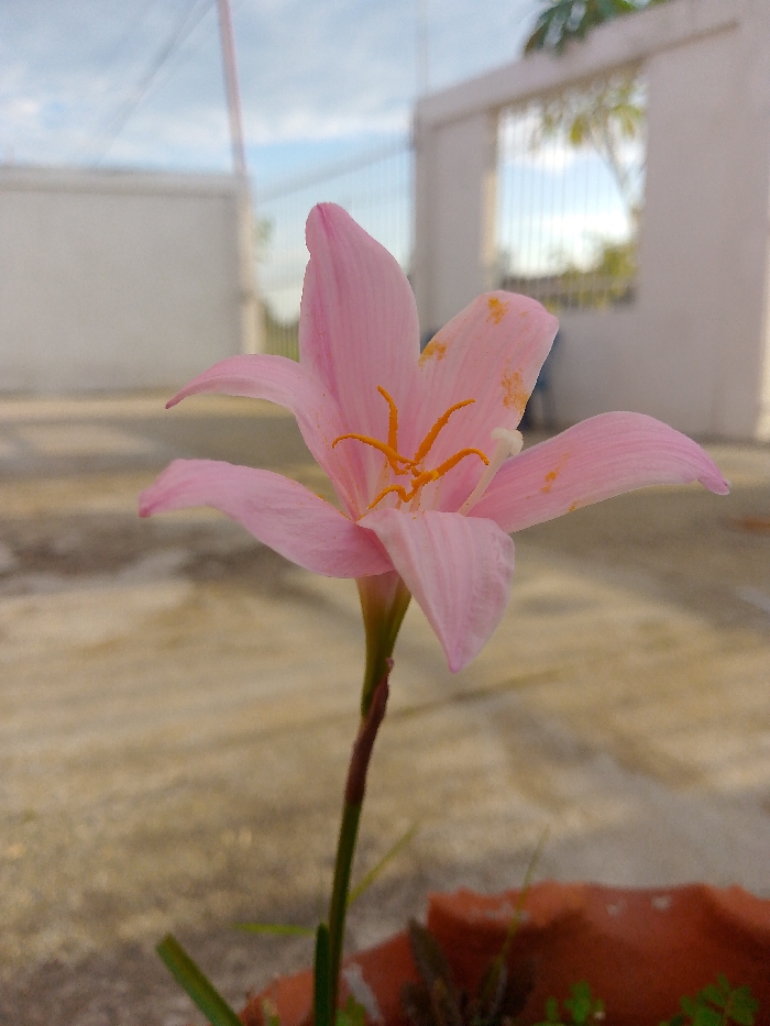 A single pink rain lily blooms in a terracotta pot. The flower features six petals, speckled with hints of orange, and prominent orange stamens. A slender, brown-green stem supports the blossom. The background shows a concrete patio and white wall with a barred gate. The sky is visible above the structure, displaying a mix of blue and gray hues.