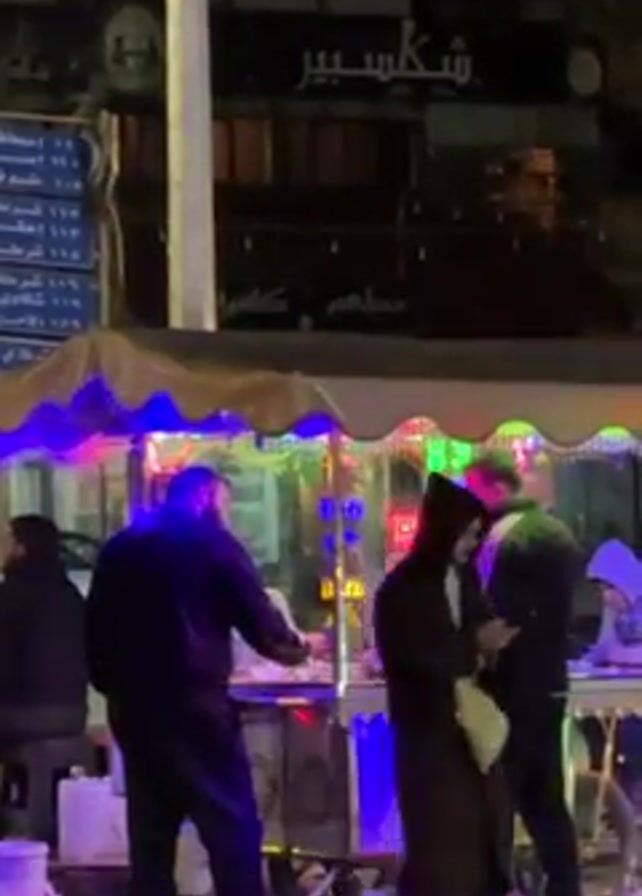 street scene at night. A brightly lit food stand is the focal point, with several people gathered around it. The stand has blue, green, and other colored lights illuminating its canopy and sides. People are standing and appear to be ordering or receiving food. There is a sign written in Arabic visible above the stand. The camera pans out to show the street. Cars are driving by, and pedestrians are walking along the sidewalk. There are trees and buildings in the background, illuminated by streetlights. The overall impression is of a typical nighttime street scene in a city, centered on the activity around the food stand.