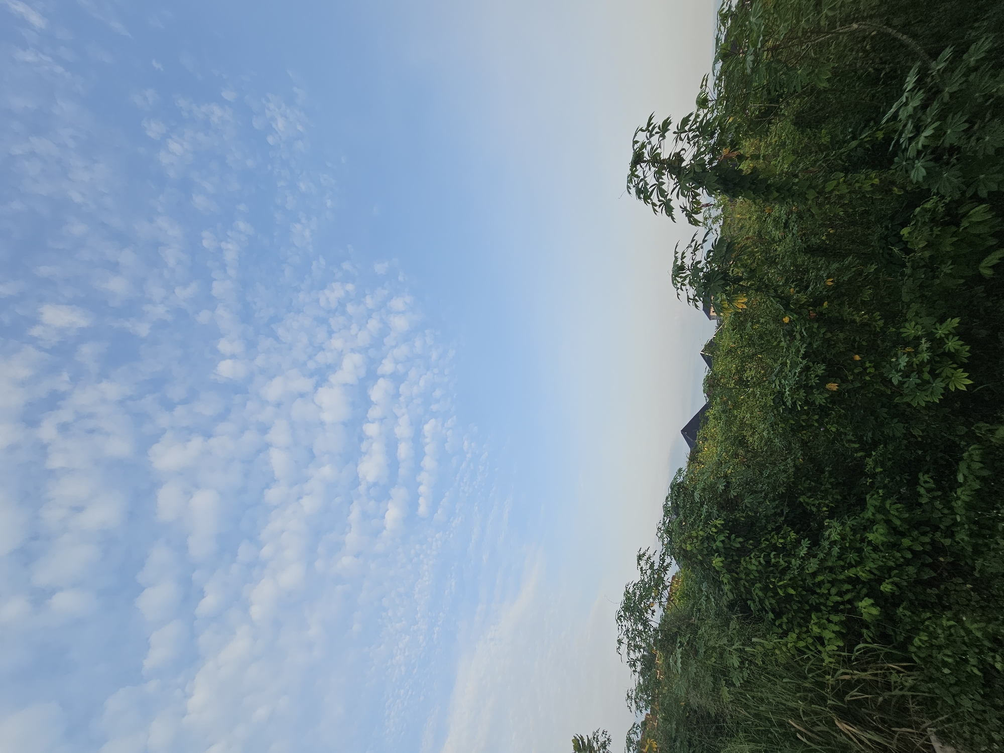The image presents a view of a partly cloudy sky dominating the left side, with a section of dense vegetation on the right. The sky exhibits a light blue hue with small, scattered white clouds. The vegetation appears lush and green, possibly overgrown, obscuring the view behind it. At the edge of the vegetation, a dark roof is barely visible, hinting at a building or structure partially concealed. No people or clear actions are discernible in the image. The location is described as being in the city of Unknown, Unknown.