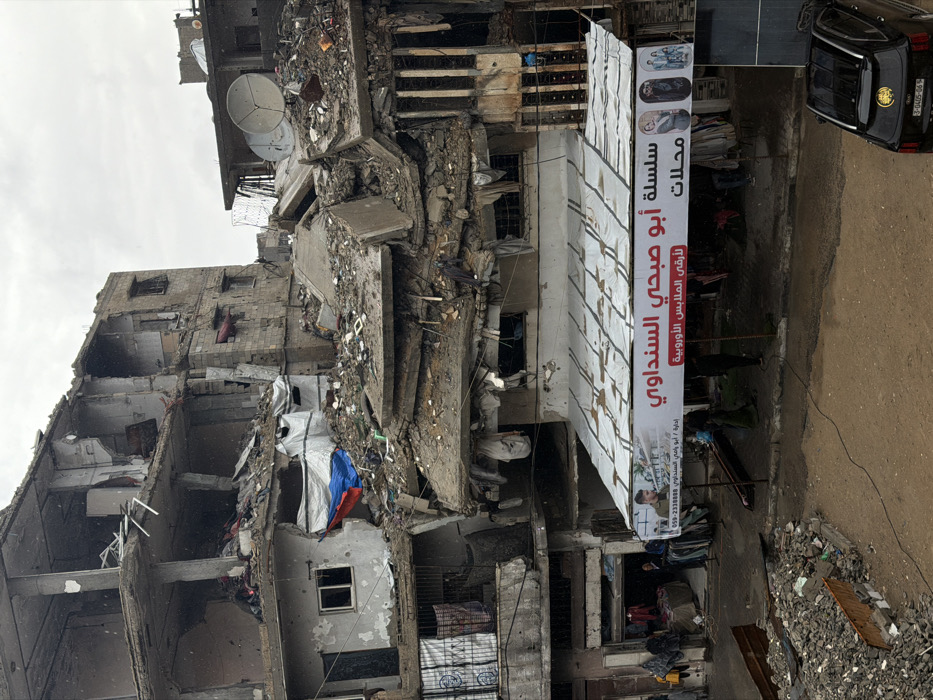 This image depicts a damaged urban environment in the city of Gaza, Palestinian Territory, under an overcast sky. Multiple multi-story concrete buildings in the background and midground show extensive structural damage, including partial collapses, exposed rebar, shattered walls, and large piles of debris on upper levels. Some facades exhibit visible impact damage or numerous small holes. Tarpaulins, including a prominent blue and red one, are visible covering parts of a lower floor of a damaged structure. Laundry is hung from visible windows or balconies of several buildings. At street level, in the midground, a prominent white banner with Arabic text translates to "Abu Sobhi Al-Sindawi Chain Stores / For the finest European clothes," displaying images of models and clothing. This banner extends as an awning over a shop entrance, where clothing is displayed on racks. Several individuals are present on the wet, muddy street: some stand near the shop, appearing to browse or interact, while others walk further down the street. In the foreground, on the left, piles of concrete and building rubble are visible. A black SUV, possibly a Kia, is parked on the right side of the street, facing away, with a visible license plate starting with '0'. A dark cable or hose lies across the wet ground in the immediate foreground. Satellite dishes are mounted on rooftops of less damaged structures in the background.