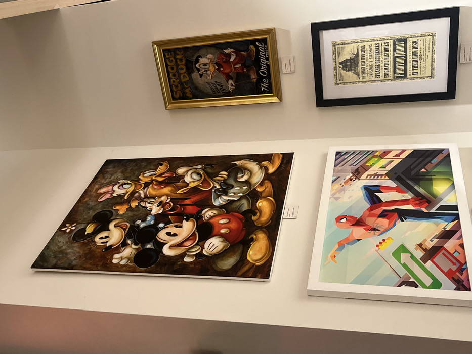 This image captures an interior wall display within a gallery or shop located in Chessy, France. The scene presents four framed artworks mounted on light-colored walls that form an inner corner. On the upper left, a large vertical canvas displays a vibrant, dark-toned painting featuring classic Disney characters: Mickey Mouse, Minnie Mouse, Donald Duck, Daisy Duck, Goofy, and Pluto, rendered in a stylized, slightly aged aesthetic. Mickey Mouse is prominently positioned in the foreground, smiling. A small white informational label is affixed to the wall directly below this artwork. To the right, on the adjacent wall, a smaller, vertically oriented artwork is housed in a golden frame. This piece is a poster-style print depicting Scrooge McDuck, with visible text including "SCROOGE MCDUCK," "Crucial Since 1947," and "The Original Tycoon." A small white informational label is present below its frame. Below the large Disney character painting, on the lower left, a medium-sized horizontal graphic art print is framed in white. This artwork depicts Spider-Man in a geometric, polygonal style, perched on a building against a stylized urban backdrop of various colored buildings and architectural elements. A small white informational label is positioned beneath this artwork. Directly below the framed Scrooge McDuck print, on the lower right, a medium-sized vertical print is enclosed in a black frame with a white mat. This print resembles a vintage poster titled "PHANTOM MANOR," detailing "STRANGE OCCURRENCES AND ENIGMATIC HISTORIES" and advising that visits are "AT THEIR OWN RISK." A small white informational label is affixed beneath this framed piece. The walls are uniformly light-colored, and the lighting is consistent throughout the displayed area, indicating an intentional exhibition setup.