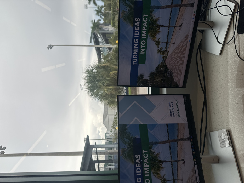 The image presents an interior view looking out through a large window, with two computer monitors positioned on a counter in the foreground. The scene is located at Florida Gulf Coast University (FGCU), near Miromar Lakes, United States, as indicated by "fgcu.edu/IMPACT" displayed on the monitors. In the immediate foreground, two identical flat-panel Dell monitors with white stands are situated on a light-colored, speckled countertop. Black cables are visible behind and around the monitor bases. A small white card or paper rests on the base of the left monitor. Both monitors display a graphic featuring palm trees lining a waterfront with a paved walkway, beneath a blue and green banner. Text on the monitors includes "TURNING IDEAS INTO IMPACT," "ITS Help Desk," and the phone number "239-590-1188," along with "fgcu.edu/IMPACT." Beyond the window, an overcast, light gray sky dominates the upper portion of the frame. The outdoor environment features several palm trees. To the far left, a portion of a covered structure or pavilion with support columns is visible. In the midground and background, multiple tall poles equipped with stadium lighting fixtures are prominent. A large stadium or bleacher structure with visible dark seating and a metal framework is present on the right side of the view. A white, rectangular building and other less defined structures are discernible in the distance. No individuals are visible within the frame.