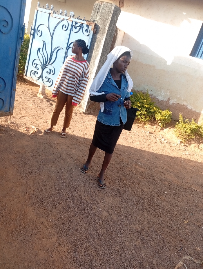 Two young women stand outdoors on a reddish-brown granular dirt surface in Jos, Nigeria. In the foreground, a woman faces right, wearing a white head covering, a light blue denim-style jacket over a black long-sleeved shirt, a black skirt, and dark flip-flops. She holds a small clear plastic bottle in her left hand. Behind her, a beige plastered building wall with a dark window frame and low green shrubs is visible. In the background to the left, a second woman faces left, dressed in a brown and white horizontal striped long-sleeved top, brown trousers, and white flip-flops. Behind her, a partially open light blue metal gate with black ornate scrollwork is visible. The scene is brightly lit by natural sunlight.