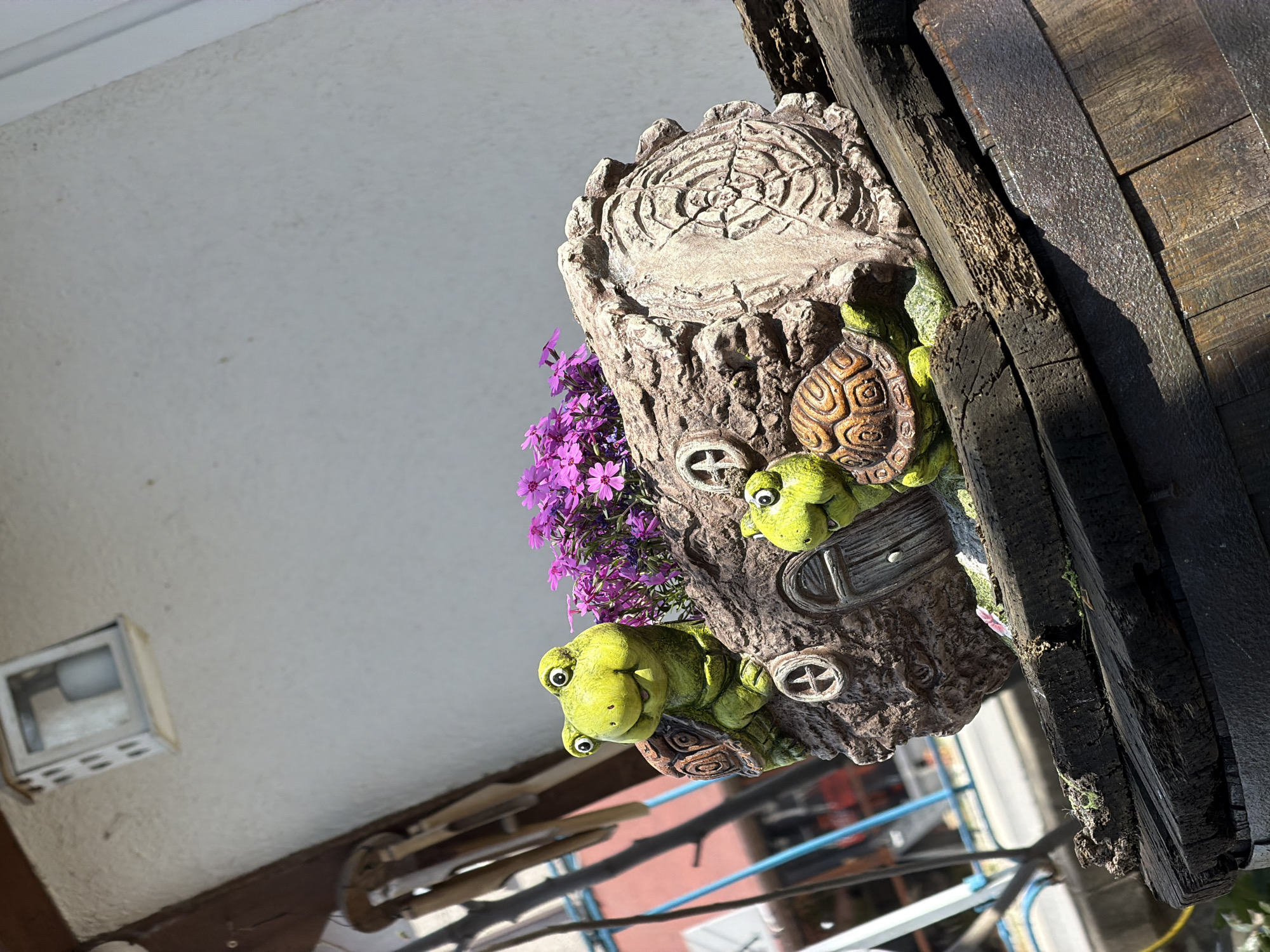 A turtle-themed planter is attached to a dark wooden barrel. The planter, shaped like a tree trunk, contains purple flowers and features two cartoonish green turtles with bulging eyes. The barrel and planter appear to be outdoors, possibly on a balcony or in a garden, based on the presence of outdoor equipment and building structures visible in the background. The environment suggests a sunny day. There are no people apparent in this image. The location is Tsalapitsa, Bulgaria.