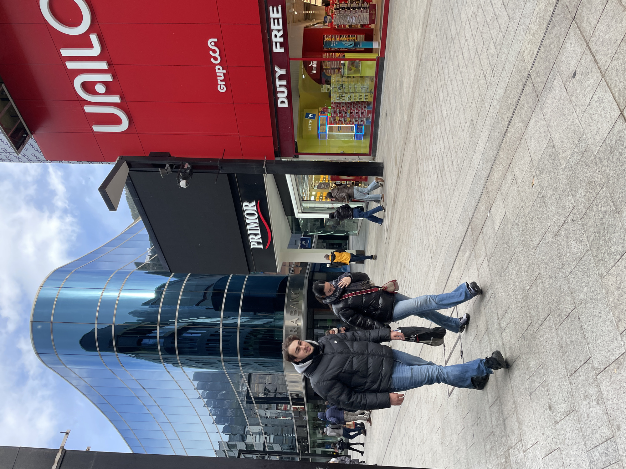 Here is a detailed description of the image: The image is taken outdoors in Andorra la Vella, Andorra. It features a street scene with several buildings and people. On the left side of the frame, a modern building with a curved glass facade reflects the sky and surrounding structures. In front of the glass building is a black sign that reads "PRIMOR," a shop chain store selling beauty and wellness products. Above Primor, there is a red building with the white lettering "UAILO Grup CCA" visible. A "DUTY FREE" shop is right of the Primor store. A man and a woman in winter clothes walk in the right side of the photo. They are both facing forward and appear to be strolling. The man is closer to the camera and smiling slightly. They are walking on a paved stone sidewalk. Other pedestrians appear in the background, along with what appears to be a bank ("RABANG"), and a small part of another building that obscures what looks like people in the background.