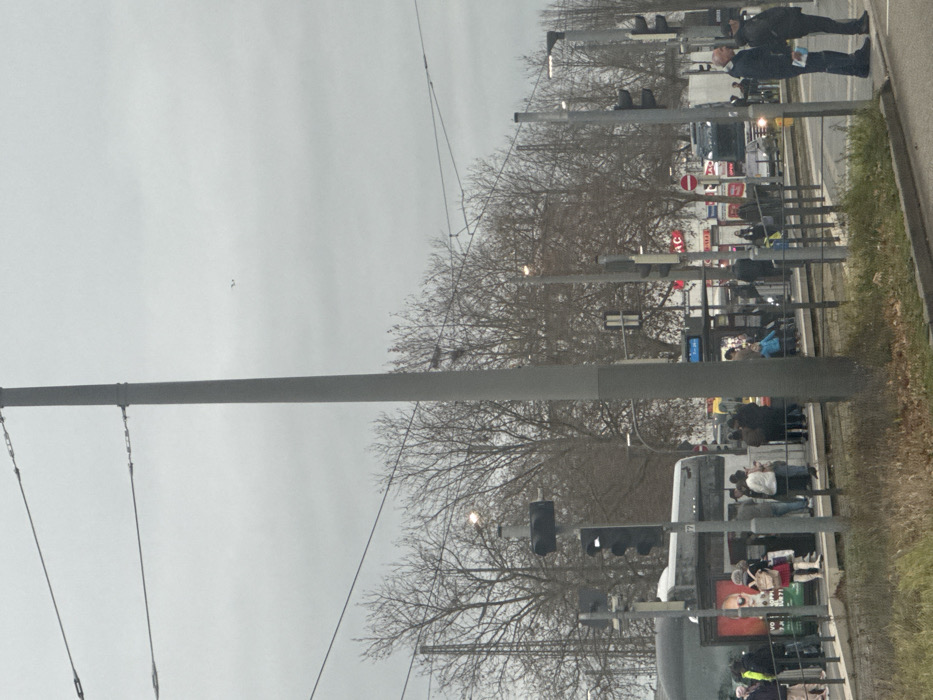 The image depicts an overcast urban street scene in Kehl, Germany, likely during cooler months given the bare trees. In the foreground, a prominent grey utility pole stands slightly right of center, supporting an array of overhead electrical wires. To the left, a public transport platform is crowded with approximately 20-30 individuals, predominantly adults, standing and waiting. A large, articulated public bus, numbered "37," is stopped at this platform, its side displaying a commercial advertisement featuring a human likeness. A woman in a red skirt and light jacket with a red bag is visible on the left side of the platform, and a child in a blue jacket is further along. Multiple black-cased traffic light poles are present, one on the left displaying a red signal. Beyond the platform, a dense line of leafless deciduous trees forms the middle ground. In the background, commercial buildings with signage, including "TAC" and other red-and-yellow branding, are visible. On the far right, on a paved surface adjacent to a roadway, two adult males stand, one holding a document or brochure. A red circular "no entry" sign is visible on the right side of the street. The sky is uniformly grey, with a faint, small dark object visible high in the upper right.