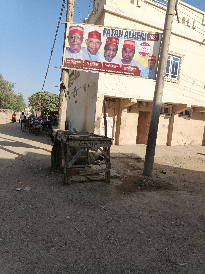 The image depicts an outdoor street scene in Kaura Goje, Nigeria, under a clear blue sky. In the immediate foreground, the ground is unpaved dirt with scattered small debris. A dilapidated wooden cart or stand, appearing to be a frame without a top, rests in the lower center, displaying faded writing that includes "DAKARE". To the right, a dark grey utility pole stands vertically. A large political banner is prominently suspended in the midground, attached to the utility pole and a light-colored, multi-story building. The banner features five smiling male individuals, four wearing red and white striped traditional caps and one on the far right wearing a plain red cap. The banner displays the text "FATAN ALHERI 2027", the logo of the "NNPP" (New Nigeria Peoples Party), and "COURTESY BABU ABDULLAHI RABSON CHAIRMAN CMC KAURA GOJE." The building behind the banner has a light-colored facade with several windows on the upper floor and multiple ground-level doorways. To the left of the banner, a simpler, weathered building or wall is visible. Further down the unpaved road, which curves slightly to the left, multiple individuals are present. Several handcarts or pushcarts, some laden with goods, are positioned along the road. A person in a white top is visible near one of these carts. In the distance, a red motorcycle is parked or in motion. Sparse trees line the left side of the road in the background. No direct interactions between individuals are discernible.