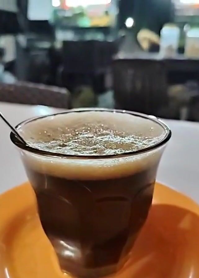 A glass of coffee sits on an orange saucer on a white table. A spoon is in the glass. The coffee has a layer of foam on top. In the blurred background, a person without a shirt walks behind a dark counter, and there are lights hanging.