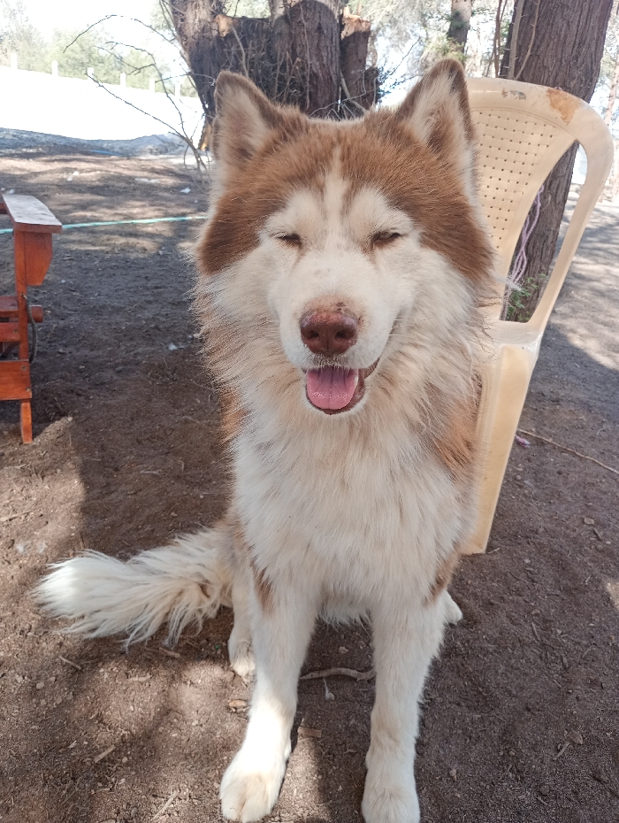 A brown and white husky dog sits in front of a tan plastic chair with its eyes closed and tongue sticking out