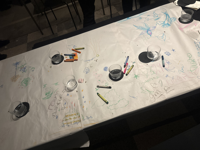 A rectangular table covered in white paper displays crayon drawings and signatures