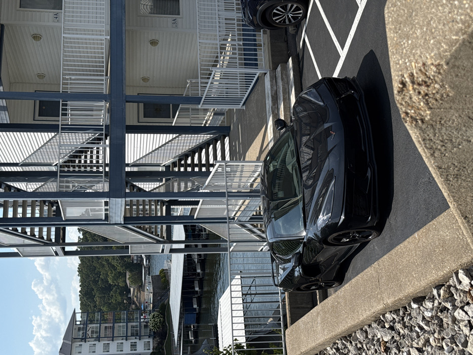 A black Chevrolet Corvette C8 is parked on a paved surface in a designated parking space, positioned in front of a multi-story residential building. The vehicle faces the viewer, slightly angled towards the right. To its right, the front portion of a dark-colored SUV or crossover is visible in an adjacent parking spot. The residential building features white horizontal siding and a prominent external metal stairwell structure with blue-grey framing and white railings, providing access to multiple units. Unit doors, such as "3A" and "4A," are visible on the lower and upper levels, respectively. Beyond the building and the concrete retaining wall in the foreground, a large body of water, identified as the Lake of the Ozarks, is visible. Multiple covered boat slips are present on the water. Hilly terrain densely covered with green trees lines the far side of the lake, where another multi-story building, likely a condominium or apartment complex, is visible. The sky overhead is bright with scattered cumulus clouds, indicating daytime. No individuals are depicted in the scene. The overall environment suggests a waterfront condominium or resort complex in the city of Lake Ozark, United States.