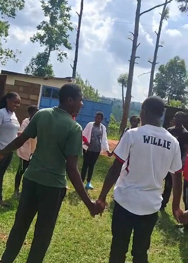 A group of approximately ten young adults is standing in a circle on a grassy lawn, holding hands. They are positioned in front of a small, single-story building with a blue door. Some are wearing casual clothes like t-shirts and jeans, while others have jackets or vests. Trees surround the area, and the sky is partly cloudy. The overall scene suggests an outdoor activity or gathering.