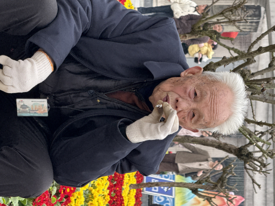 An elderly man with white hair and a weathered face sits outdoors, holding a cigarette in his gloved hand. He wears a navy jacket over a dark vest and black pants. A laminated tag hangs from his jacket, displaying a building or monument. Behind him, a vibrant display of red and yellow flowers stretches into the background, where blurred figures of people can be seen along with a bare tree. The scene appears to be a public park or outdoor gathering.