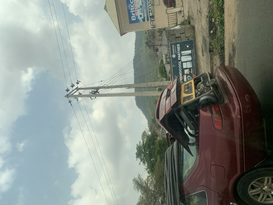 The scene depicts an outdoor urban/semi-urban environment in Lokoja, Nigeria, under an overcast sky. In the foreground, a dark red sedan, possibly a Toyota Camry, is visible on a paved road, oriented with its rear towards the viewer. The car's trunk lid is open at an upward angle, revealing its contents: a yellow portable generator, partially obscured, and another darker-colored generator positioned behind it. Coiled black material, resembling thick hose or cable, is strapped onto the trunk area or roof of the car. To the right of the sedan, an unpaved shoulder borders the road. In the midground, a tall utility pole stands vertically, equipped with multiple insulators and carrying several electrical wires. A single individual, identified as a utility worker, is observed actively positioned on the upper section of this pole, engaged with the wiring. Further to the right, a light-colored commercial building features two blue billboards. The upper billboard displays "Britco Store," while the lower one reads "THERMOCOOL PARTNER." The background reveals a prominent, vegetated green hill or mountain range with visible rock formations, typical of the Nigerian landscape. Various trees and foliage are scattered across the midground and background, contributing to the natural environment surrounding the developed area.