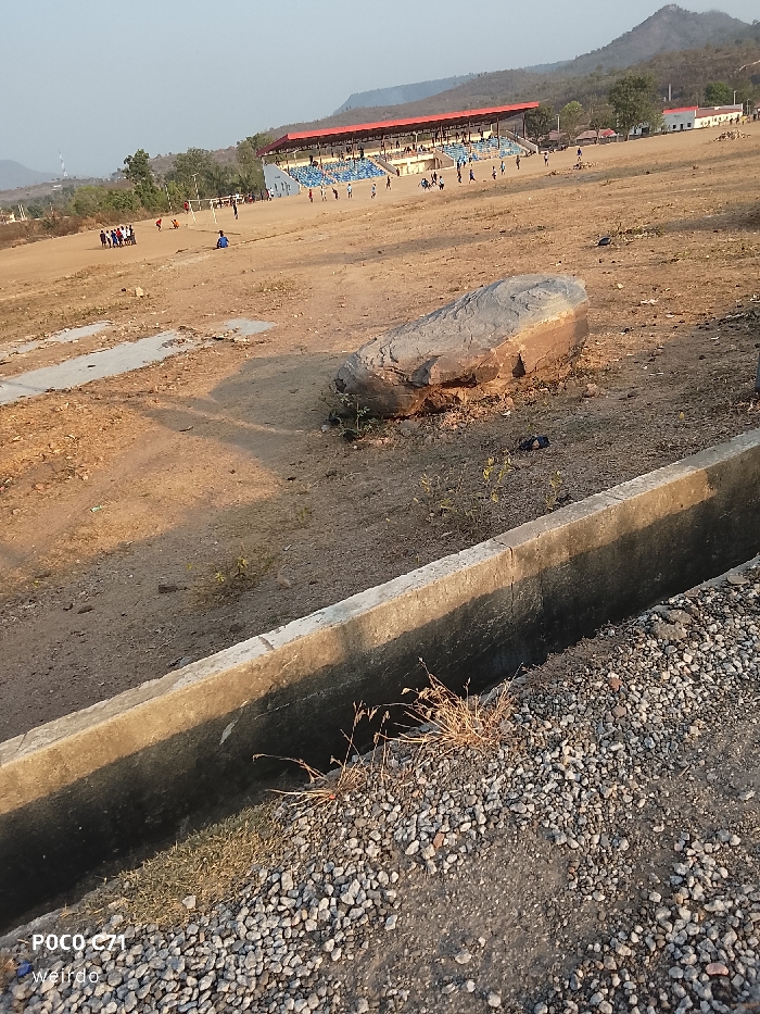 The image displays an expansive outdoor sports complex, identified as the Lokoja Confluence Stadium in Lokoja, Nigeria, under clear daytime conditions. In the immediate foreground, a concrete drainage channel runs diagonally from the lower right towards the center, flanked by a patch of small grey gravel and dry earth with sparse vegetation. A "POCO C71 Weirdo" watermark is visible in the lower left corner. The midground consists primarily of barren, light brown earth, upon which a large, elongated grey boulder rests slightly left of center. To the left of the boulder, several light-colored concrete slabs are embedded in the ground. Multiple individuals are present across this dusty field: a group of approximately 10-15 people is gathered in the left midground, while another individual wearing a blue shirt is situated further back. In the background, the main stadium structure is prominent, featuring a red roof spanning blue tiered seating. Numerous people are visible on the stadium grounds and within its seating area. Beyond the stadium, several smaller white buildings with red roofs are discernible. The distant horizon is characterized by a range of green, tree-covered hills, with a telecommunication mast visible on a far-left hill. Natural sunlight casts distinct shadows across the scene.