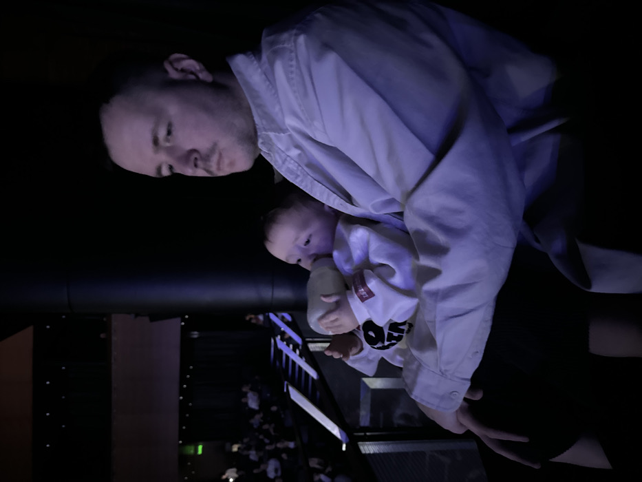 The scene depicts an adult male holding an infant on his lap within a dimly lit auditorium or theater in Unknown, Russia. The adult male, with short dark hair and a mustache, is seated in profile, facing right. He wears a light-colored long-sleeved collared shirt and dark trousers. The infant, positioned on the adult's lap, wears a light-colored long-sleeved garment with dark markings and a red label on the right sleeve. The infant is actively consuming liquid from a white baby bottle, which it holds with both hands. In the background, multiple rows of dark seating are visible, partially occupied by indistinct figures. A diagonally oriented handrail with internal illumination and a dark vertical pillar are also present. The environment is characterized by low, ambient bluish-purple lighting.