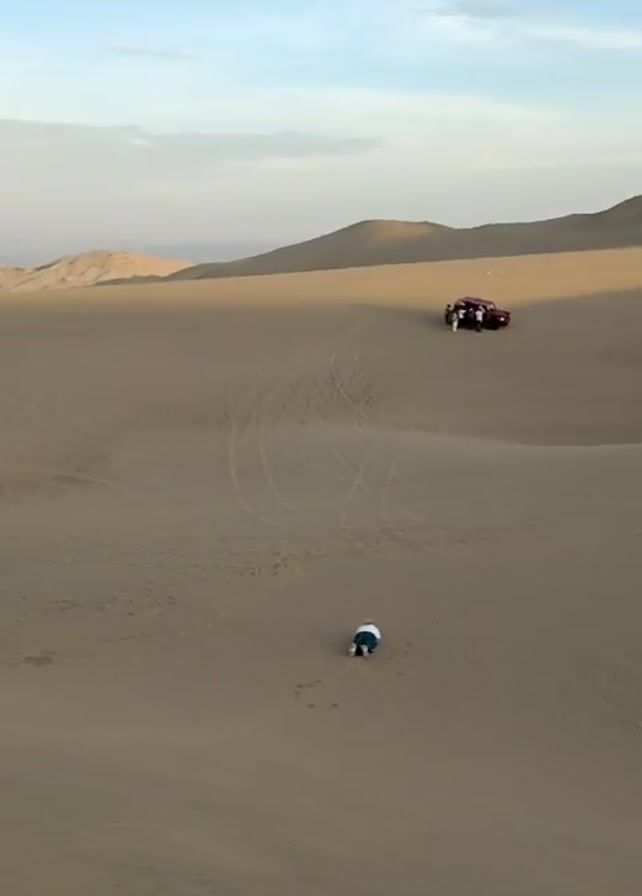 desert landscape under a blue sky with scattered clouds. In the first shot, a person is kneeling on the sand while a red off-road vehicle is parked in the distance. The camera then pans to reveal a vast expanse of sand dunes. The next shot shows a group of three women standing on a dune, holding sandboards. In the final scene, two men, each carrying a sandboard, walk towards the women. The setting seems to be a recreational area where sandboarding is a common activity.