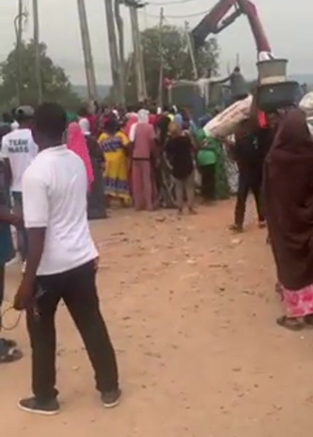 crowd of people gathered on a dirt road. In the background, a truck with a crane is lifting objects. Several men are carrying large bags and buckets on their heads through the crowd. The bag in the center of the shot is labeled "Golden Penny Confectionery Wheat Flour." Power lines and poles are visible overhead. Some people in the crowd are wearing traditional clothing.