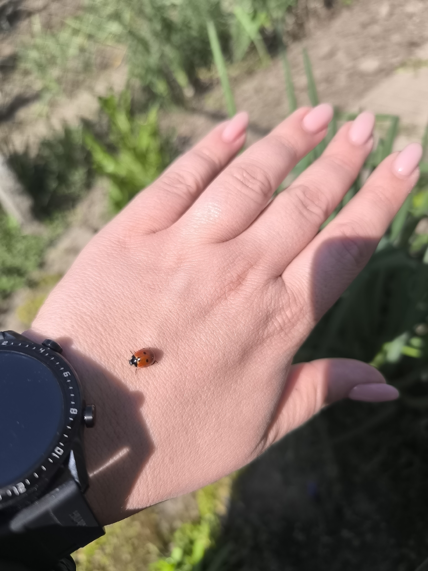 A person's hand is open, palm up, with a ladybug on the wrist, near a smartwatch
