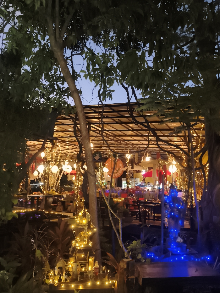 This image depicts a nighttime scene of an outdoor or semi-outdoor restaurant and bar located in Baan Mae Nam, Thailand