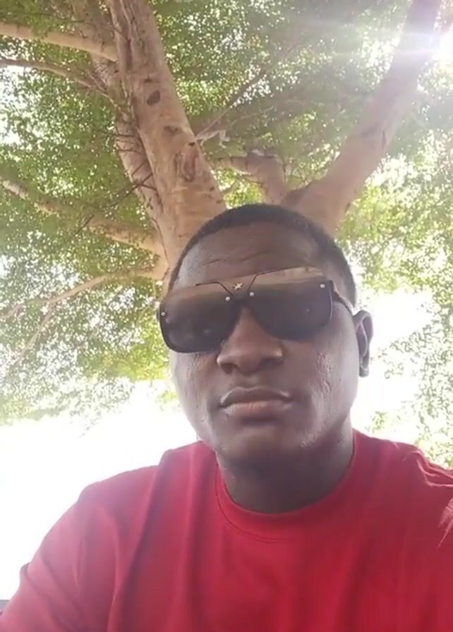 A man with dark skin and sunglasses is looking at the camera. He is wearing a red shirt. Behind him is a tree with green leaves and sunlight filtering through. He holds up two fingers in a peace sign.