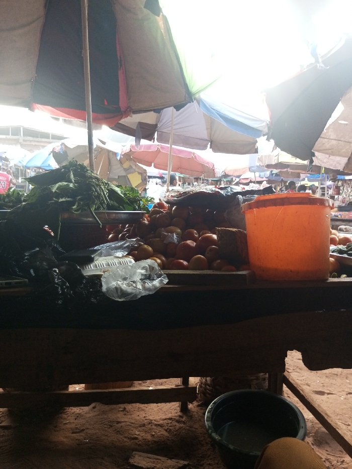 The image depicts an outdoor market scene under bright sunlight, characterized by numerous vendor stalls shaded by an array of open umbrellas. The ground is composed of reddish-brown dirt or sand. In the foreground, a wooden market stall table is heavily laden with produce. On the left, a large quantity of dark green leafy vegetables is piled. To the right of the greens, a substantial mound of red and orange spherical fruits, likely tomatoes, occupies the center of the table. Adjacent to these, a clear plastic bag and a white, opaque plastic container are visible. On the far right of the table, an orange plastic bucket, partially filled with liquid, stands upright. Below the table, on the ground, a black plastic basin containing liquid is positioned. The lower right corner of the frame reveals a person's knee, clad in light brown fabric. The midground and background consist of a densely packed market area with multiple stalls, each sheltered by variously colored umbrellas including black, red, white, blue, and beige. Human figures are indistinctly visible among the stalls, indicating active commerce. One individual in the left midground appears to be wearing a red jersey with the number "23" visible. The bright, almost overexposed, sky and umbrella canopy suggest strong daylight conditions. No specific interactions are discernible, but the setup indicates ongoing market operations. The location is an outdoor market in an unidentified city.