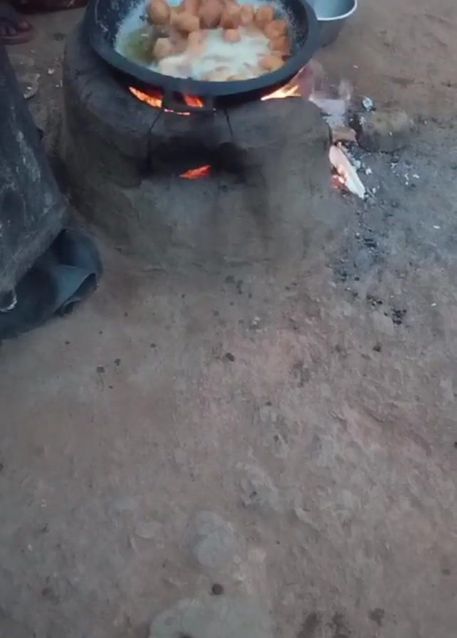 A person is cooking small, round dough balls in a wok on a traditional, homemade stove. The stove is made of clay or mud and has a fire burning inside. The person is using a slotted spoon to turn the dough balls in the hot oil. Next to the wok is a small metal container. The ground around the stove is dirt. A bag and what appears to be a patterned cloth is in the background.