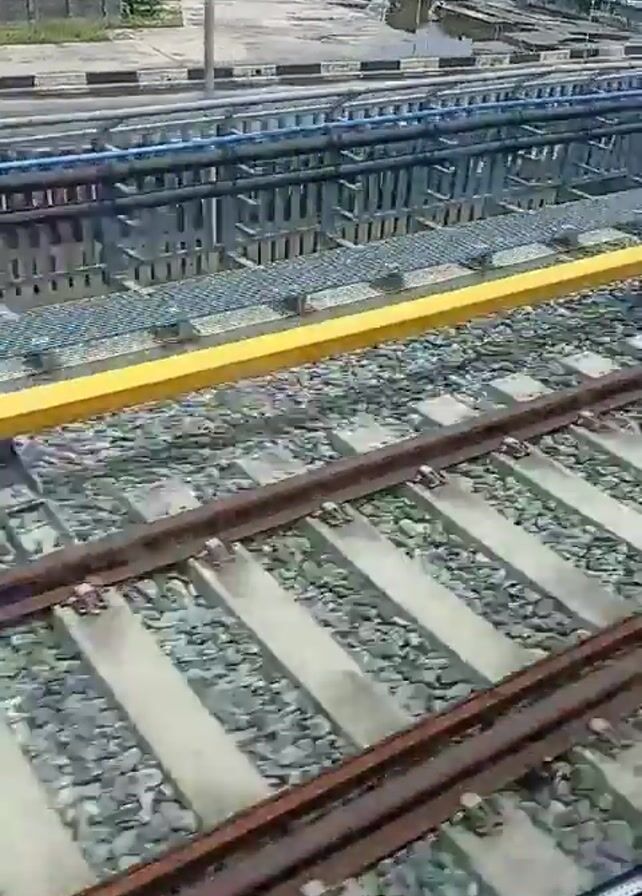 view from a train moving along a railway track. The train is moving over a concrete structure. Below, there is a street and a container. Beyond the tracks, there is a road with a white SUV driving on it. There is also an industrial area with some buildings and trees in the background. The railway track itself is made of concrete and gravel with a yellow bar running alongside it. The train is passing by a silver metal railing. A red advertisement can be seen briefly.