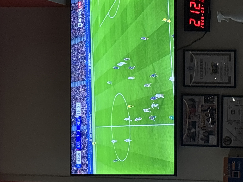 An indoor scene in Gabrovo, Bulgaria, displays a large flat-screen television showing a football (soccer) video game