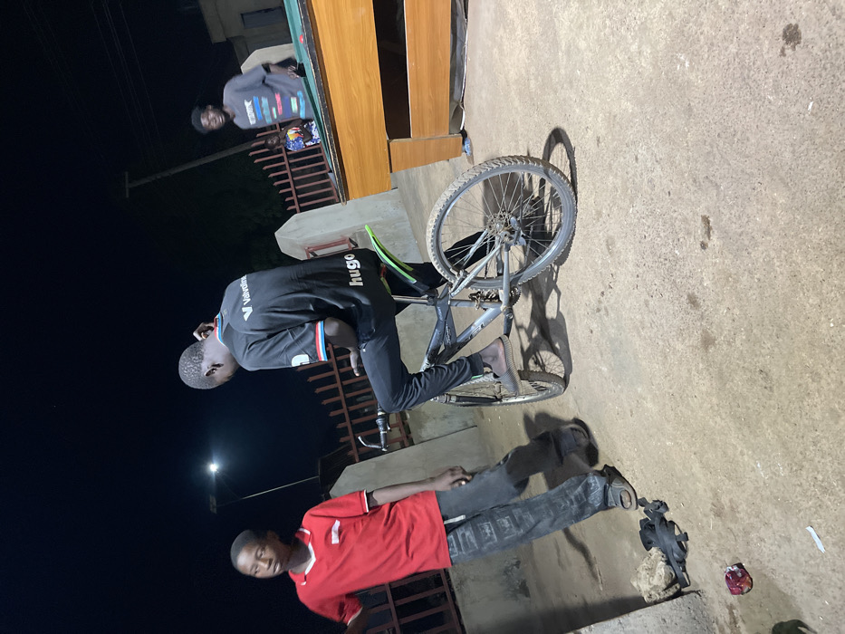The image displays a nighttime outdoor scene in Unguwar Gabas, Nigeria, illuminated by an overhead light source. In the foreground left, a young male wearing a red polo shirt, dark distressed trousers, and sandals stands, looking towards the left. In the midground, a male wearing a black t-shirt with "Valvoline" and "hugo" logos, and dark trousers, is seated on a grey bicycle equipped with a green rear mudguard. His left foot rests on the concrete ground, and he appears to be looking down at an object in his hands. In the background right, another male wearing a light-colored graphic t-shirt stands near a wooden pool table with a green felt playing surface, observing the scene. A fourth individual, possibly a child, is partially obscured behind the pool table. The ground consists of a worn concrete slab with minor debris, including a crumpled dark item and a wrapper, in the foreground. A reddish-brown metal fence runs across the mid-background, with a concrete pillar visible to its left. Architectural structures are faintly visible in the far background.