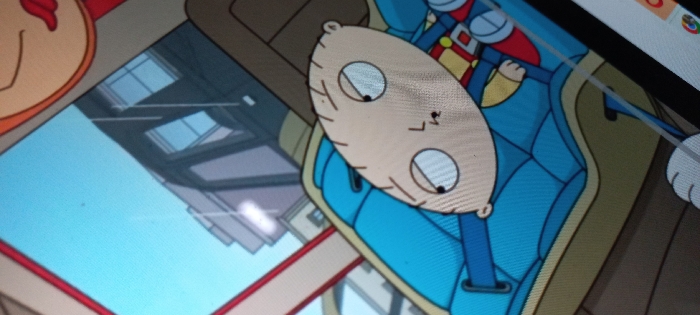 cartoon scene featuring Stewie Griffin from the animated television series "Family Guy." He is situated within what appears to be a seat or harness of some kind, depicted in shades of blue with beige trim. Stewie's expression appears quizzical. In the background, a building with a glass facade is visible, set against a blue sky. The scene is captured as a photograph of a screen or tablet, with a portion of the device's interface visible at the top right.