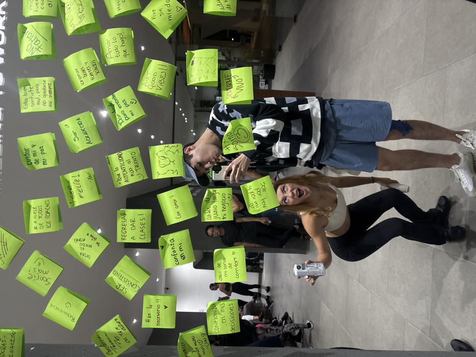 - "Two individuals pose in front of a wall covered in green sticky notes with handwritten affirmations and motivational messages" by FM-yooU93, licensed under CC BY 4.0