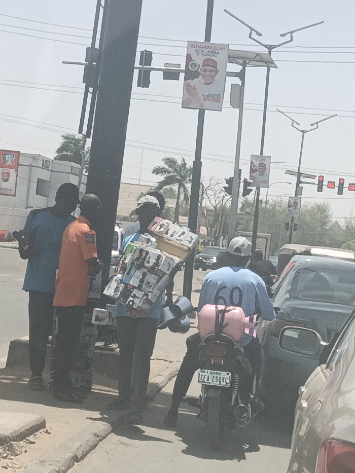 This image depicts a sunlit urban street scene in Tarauni, Kano State, Nigeria. The foreground left features three adult males standing on a concrete pavement. The leftmost man wears a light blue t-shirt and dark trousers, holding a dark rectangular object. Adjacent to him is a man in an orange short-sleeved shirt and patterned trousers, also holding a dark object. To their right, another man, wearing a blue t-shirt and a white baseball cap, carries a large wooden tray system on his shoulders, laden with numerous small, packaged electronic items or accessories, and has several silver metallic buckets hanging from his left side. In the foreground right, a black motorcycle is stopped in traffic. Its rider, an adult male, is visible from the rear, wearing a light blue t-shirt with the number "69" printed in white on the back and a light grey baseball cap. A pink gas cylinder is strapped vertically to the back of the motorcycle, which bears a Nigerian license plate: "TFA-25QVC". A dark sedan is positioned directly to the left of the motorcycle, and parts of other vehicles are visible in dense traffic. The background reveals a street lined with utility poles, some equipped with solar panels. Multiple political campaign posters are affixed to these poles, displaying the image of a smiling man in a white cap and the text "ALHAMDULILLAH GOV. ABBA IS WORKING" and "ALH. ABBA KABIR YUSUF GOVERNOR". Traffic lights, showing red signals, are visible further down the street on the right. Palm trees and other sparse vegetation, along with indistinct buildings, complete the background under a bright, clear sky.