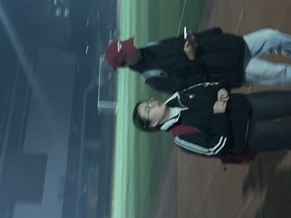 Two individuals are depicted walking from left to right on a reddish-brown running track at a sports facility in the city of Jiangjin, China. The scene is illuminated by artificial lights, casting a soft glow on a green sports field, likely artificial turf, which features white markings and a white goalpost in the background. Dark, indistinct structures are visible beyond the field. The individual on the left is female, wearing clear-framed glasses, a dark jacket with white stripes on the sleeves over a light-colored high-collar garment, dark pants, and a reddish-brown backpack. Her hands are clasped, and her gaze is directed slightly upwards and right. The individual on the right is wearing a dark red baseball cap pulled low, a dark jacket, light blue jeans, and a light-colored backpack. This individual is holding a white smartphone horizontally and appears to be focused on its screen. Both individuals are in motion.
