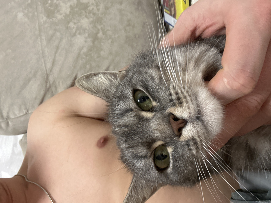 - "A gray tabby cat with striking green eyes and white whiskers is held in a person's hand" by FM-eEmkS2, licensed under CC BY 4.0