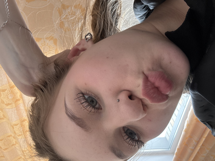 - "A young female subject with light skin, light brown hair, and blue-grey eyes featuring pronounced mascara is depicted in a close-up, upward-angled shot" by FM-MDVA83, licensed under CC BY 4.0