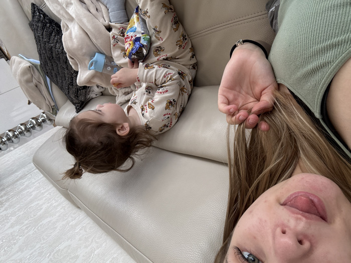 An indoor scene in Bratislava, Slovakia, depicts two individuals on a light-colored sofa. In the upper left quadrant, an adult female is partially visible, featuring light-colored hair, a blue-green left eye, and her tongue extended from her mouth. She wears a light green ribbed tank top, and her right hand, adorned with a black elastic wristband and silver charm, holds strands of her hair. To the right, a young child with brown hair, styled in a small top bun, sits on the same sofa. The child wears light-colored pajamas patterned with cartoon characters, looks downwards, and holds a small orange item in the left hand while clutching a partially opened blue and white snack bag in the right. A light blue cup is positioned near the child, alongside a beige blanket and a dark, textured cushion. In the background, a series of cylindrical metallic objects are visible, likely part of a fixture. The sofa is upholstered in a light beige material.