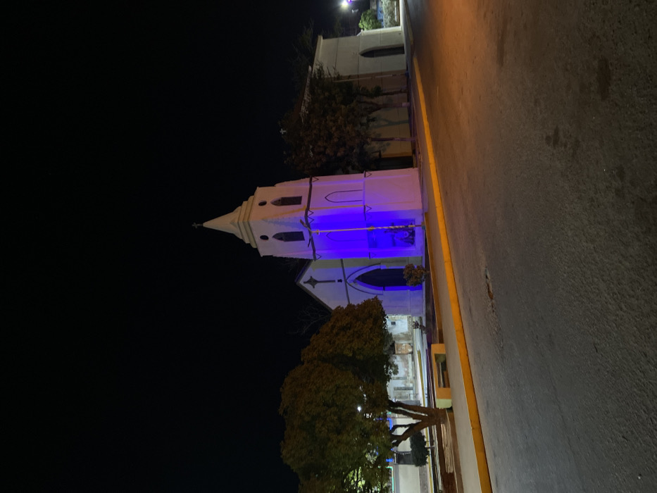 A night shot features a white church illuminated with blue lights. The church has a pointed spire and arched windows. A mature tree stands in front of the church. Adjacent to the church is a paved street with a yellow curb. The sky is black.