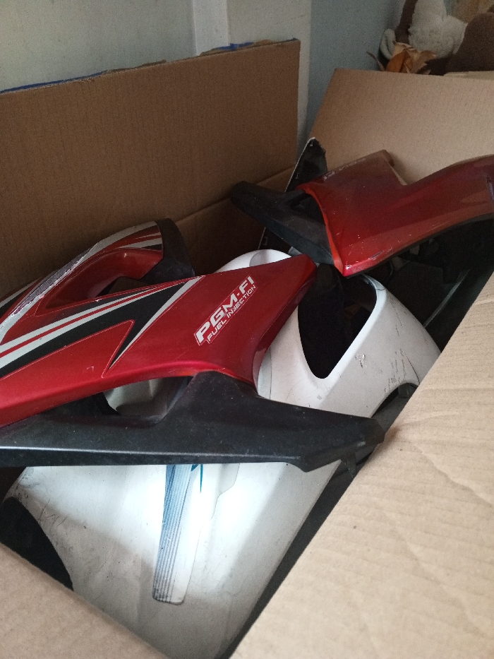 A cardboard box contains motorcycle fairing parts. Predominantly red and white components are visible, along with black trim. "PGM-Fi FUEL INJECTION" is printed on a red section. The parts are in disarray inside the box, suggesting they are spares or being stored. A soft, plush toy is partially visible in the background, behind the box.