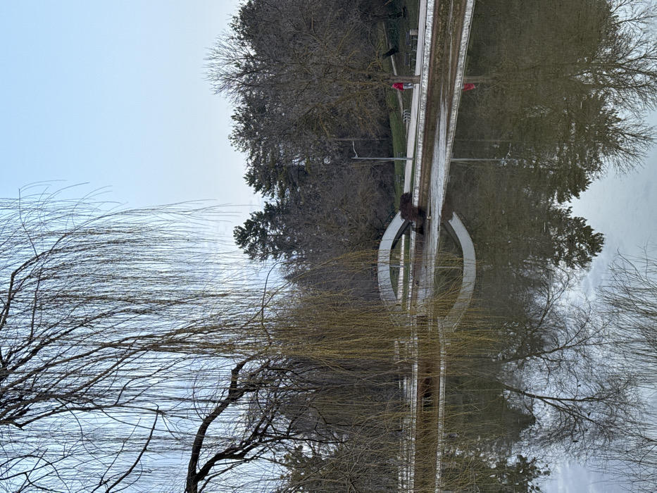 The image depicts a tranquil outdoor scene within St. George Park (Gradski park "Sveti Georgi") in Dobrich, Bulgaria. The central feature is a calm body of water, likely a pond or narrow lake, that occupies the lower half of the frame. The water's surface exhibits reflections of the sky, surrounding trees, and a prominent white pedestrian bridge. In the foreground, a large weeping willow tree dominates the left and upper sections, its numerous thin, bare branches with a slight greenish-yellow tint hanging vertically and partially obscuring the view. Across the water, a distinctive white, arched pedestrian bridge is visible, spanning from the left bank to the right. A paved pathway runs parallel to the water on the far bank. Along this pathway, a single individual is observed walking from right to left. This person is dressed in a red or pink jacket and dark trousers. Further along the pathway, a tall streetlamp with a single light fixture is positioned, and two dark-colored park benches are visible to its right. The background consists of a dense arrangement of trees. The majority are deciduous, currently bare of leaves, indicating a winter or early spring season. Interspersed among them, particularly towards the right, are coniferous trees with dark green foliage. The sky above is a pale, clear blue with minimal cloud cover. The overall lighting suggests daytime, possibly early morning or late afternoon, with soft, diffuse illumination.