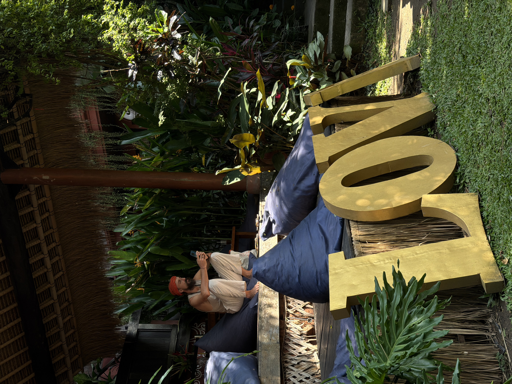 A photograph, taken outdoors in Peliatan, Indonesia, depicts a man sitting cross-legged, barefoot, and holding a smartphone. He is on an elevated wooden platform cushioned with blue pillows. Behind him is a thatched roof structure. To the right, large gold letters spelling out "LOVE" are positioned on the platform, partially obscured by foliage. The background includes lush green vegetation, some stone steps, and a grassy area. The image is taken at an angle that is off center.